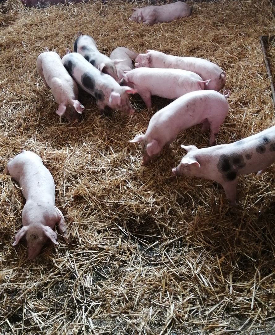 Bei uns leben die Schweine in Vierer- oder Fünfergruppen in hellen, großen Abteilen. Sie haben ein weiches Strohbett und viel Spielzeug, das aufgrund der Intelligenz der Tiere häufig gewechselt werden muss.